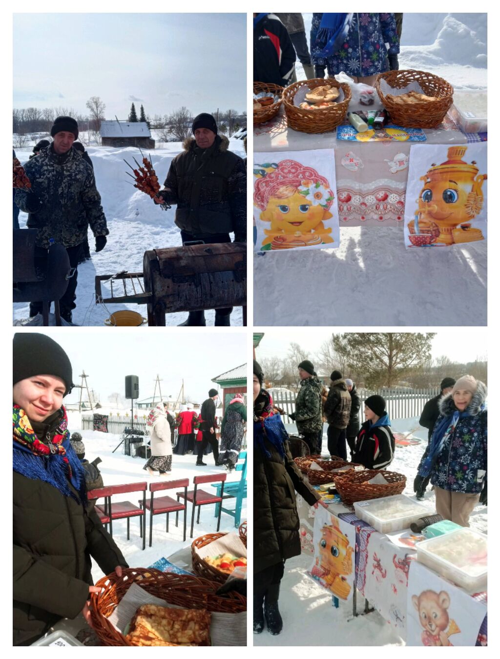 16 марта во время масленичного гуляния деревенские умельцы угощали односельчан вкусными пирогами, блинами, ухой, шашлыками, а мальчишки и девчонки лакомились свеженькими пирожными с ароматным чаем .