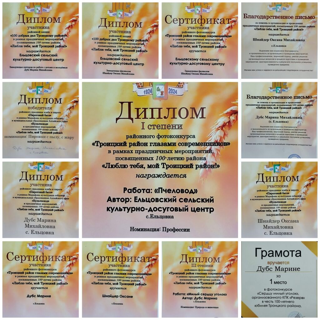 Ельцовский СКДЦ принял участие в масштабном мероприятии "Люблю тебя, мой Троицкий район!", посвящённом 100-летию района. В нашей копилке достижений прибавление, за участие в масштабном мероприятии. Грамоты, дипломы, благодарственные письма, сертификаты, ура!