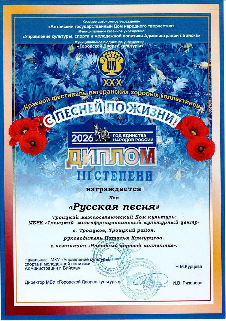 19 апреля 2026 года в «Городском Дворце культуры» города Бийска прошел XXX краевой фестиваль ветеранских хоровых коллективов «С песней по жизни», посвященный году единства народов России, в котором приняли участие как местные исполнители, хоры и ансамбли, так и гости из городов и районов Алтайского края и Республики Алтай.